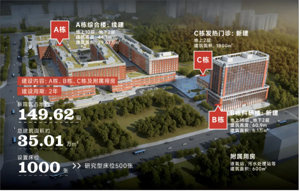 该项目将分期建设,一期总建筑面积14.2万平方米,投资11.4亿元,建设床位500张。主体建设周期4年,计划于2026年年底建成运营。