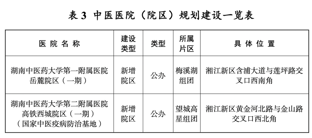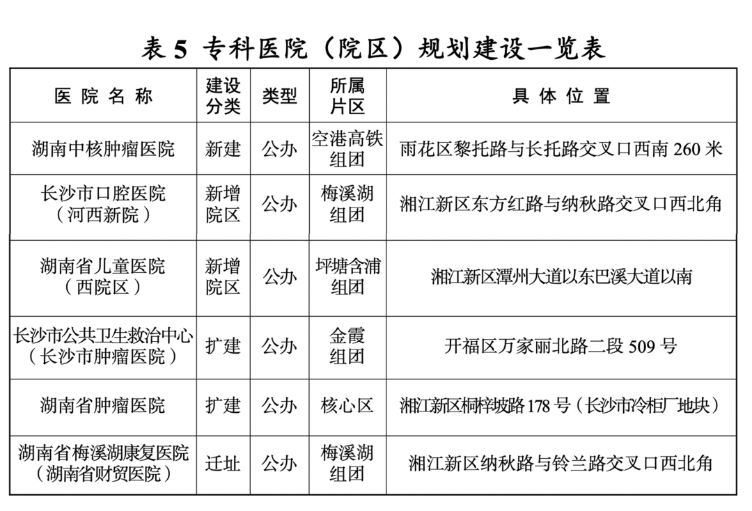此外,中南大学湘雅三医院、南华大学附属第七医院(湖南省荣军优抚医院)、长沙市第四医院、滨水新城院区二期、湖南航天医院二期扩建规划也在其中。