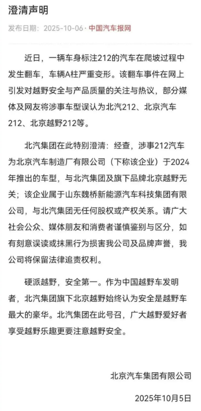 10月6日晚,北汽集团发布澄清声明,急于与近日发生的“212汽车爬坡翻车事件”划清界限。“涉事212汽车为北京汽车制造厂有限公司于2024年推出的车型,与北汽集团及旗下品牌北京越野无关”,北汽集团在声明中强调,并指出北京汽车制造厂有限公司属于山东魏桥新能源汽车科技集团有限公司,与北汽集团无任何股权或产权关系。