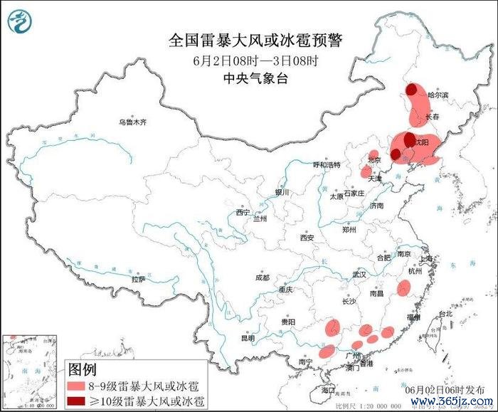 预计6月2日8时至3日8时,东北地区中西部、华北东北部、江南东北部、华南中北部等地的部分地区将有8级以上雷暴大风或冰雹天气,其中,黑龙江西南部、吉林西北部、辽宁中西部等地的部分地区将有10级以上雷暴大风,最大风力可达11级以上,辽宁中西部等地局地不排除出现龙卷的可能性;东北地区中北部、江南中东部、华南中东部、西北地区南部、西南地区北部和南部等地的部分地区将有小时雨量大于20毫米的短时强降水天气,其中,福建东部和南部、云南东南部、广东中南部等地的部分地区小时雨量大于50毫米。